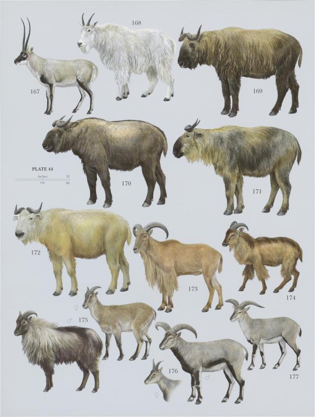 takin and some close relatives: 167) Chiru (Pantholops hodgsonii), 168) Rocky Mountain Goat (Oreamnos americanus), 169) Mishmi Takin (Budorcas taxicolor), 170) Bhutan Takin (Budorcas whitei), 171) Sichuan Takin (Budorcas tibetana), 172) Golden Takin (Budorcas bedfordi), 173) Aoudad (Ammotragus lervia), 174) Arabian Tahr (Avabitragus jayakari), 175) Himalayan Tahr (Hemutragus jemlahicus), 176) Greater Blue Sheep (Pseudois nayawr), 177) Dwarf Blue Sheep (Pseudois schaeferi)