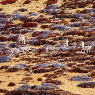 Bharals are gregarious animals, with group sizes ranging from five to 400 individuals. Herd size depends on season, population size, habitat condition, hunting pressure and disturbance. Herd composition changes frequently as single members and groups join and part. Aggressive behaviors include broadside display, horning vegatation, jerk and lunge, head shake, jump, butt, and clash among the members. Females also behave aggressively toward other females sometimes biting. /=\