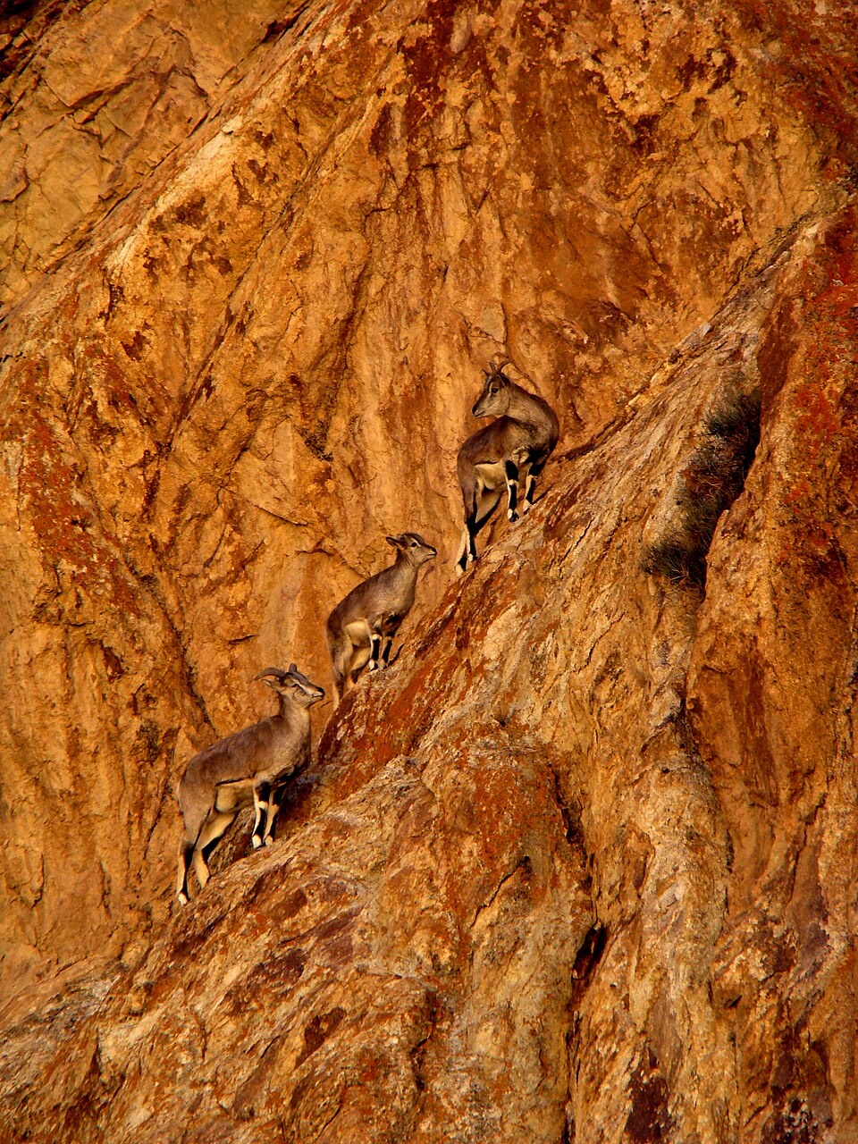 Bharal (Pseudois nayaur) also called blue sheep. A kind of caprine (goat) native to the high Himalayas and the only member of the genus Pseudois, they are found Nepal, Pakistan, India, Bhutan, Myanmar, and in China in the provinces of Gansu, Ningxia, Sichuan, Tibet, and Inner Mongolia. The Helan Mountains of Ningxia have the highest concentration of bharal in the world, with 15 bharals per square kilometers and 30,000 in total. [Source: Wikipedia]