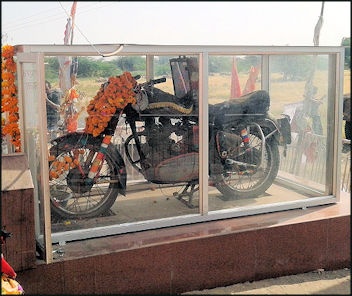 Jodhpur is the home of motorcycle deity and temple that honors him — at Bullet Baba Temple on NH65 . Devotees there tie threads on he main deity, a 350cc Royal Enfield Bullet motorcycle. The temple is officially called Om Banna, but is better known as the Bullet Baba temple. temple It is in Pali, about 75 kilometers (46 miles) from Jodhpur. The deity of the roadside temple — the motorcycle — kept on a pedestal. The motorcycle belonged to local resident Om Singh Rathore who died in an accident on the highway connecting Jodhpur to Jaipur city in the 1980s. The temple is a popular rest stop spot for long-haul truck drivers who stop at the temple to offer prayers to keep them safe on India notoriously dangerous highways. [Source: Faizal Khan, BBC, November 8, 2021]