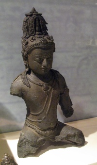 Srivijayan art and architecture blended Indian influences—especially from the Gupta and Pala traditions—with local aesthetics, producing a distinctive Mahayana Buddhist style that spread across maritime Southeast Asia. Although most of its physical structures have not survived as well as those in Java, Srivijaya is known for graceful bronze and stone sculptures of Bodhisattvas such as Avalokiteshvara, often depicted with haloes, intricate jewelry, and richly detailed garments. The kingdom made extensive use of bronze, gold, and silver for religious images and ceremonial regalia, alongside clay votive tablets that became widely distributed throughout the region. Decorative arts flourished as well, with elaborate gold and silver objects and ceramics that reflect active trade connections with China. Eclectic in character, Srivijayan art absorbed elements from India, the Mon-Dvaravati sphere, Cambodia, and Java, creating a unique and influential regional style.