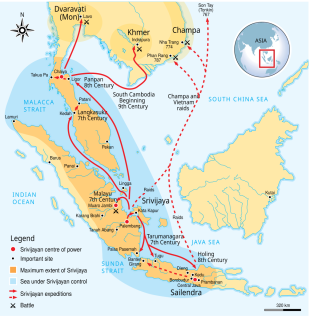 in Jambi in the 13th century The important Strait of Melaka (Malacca) which facilitated trade between China and India. With its naval power, the empire managed to suppress piracy along the Malacca strait, making Srivjayan entrepots the port of choice for traders. Despite its apparent hegemony, the empire did not destroy the other non-Srivijayan competitors but used them as secondary sources of maritime trade. Srivijaya’s wide influence in the region was a mixture of diplomacy and conquest, but ultimately operated like a federation of port-city kingdoms. Besides the southern centre of power in Palembang, Arab, Chinese and Indian sources also imply that Srivijaya had a northern power centre, most probably Kataha, what is now known as Kedah on the western side of the Malay peninsula. Kedah is now known for remains of Indian architecture at the Bujang Valley. This was due to the invasion by the Chola kingdom from South India —“ an invasion which ultimately led to the fall of Srivijaya.