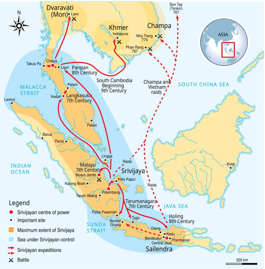 Dominating the Malacca and Sunda straits, Srivijaya controlled the trade of the region and remained a formidable sea power until the thirteenth century. Serving as an entrepôt for Chinese, Indonesian, and Indian markets, the port of Palembang, accessible from the coast by way of a river, accumulated great wealth. Control over the burgeoning commerce moving through the Strait of Malacca. This it accomplished by mobilizing the policing capabilities of small communities of seafaring “orang laut” (Malay for sea people), providing facilities and protection in exchange for reasonable tax rates on maritime traders, and maintaining favorable relations with inland peoples who were the source of food and many of the trade goods on which commerce of the day was built. But Srivijaya also promoted itself as a commanding cultural center in which ideas from all over Buddhist Asia circulated and were redistributed as far as away Vietnam, Tibet, and Japan. Srivijaya declined in the 11th century because of forced changes in trade routes brought about by increased piracy in the Sunda and Malacca Straits.