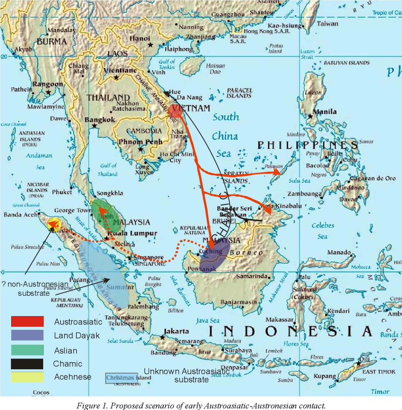 Austronesian-speaking peoples originated in southern China but developed as a distinct group in Taiwan. Beginning 4,000–5,000 years ago, they launched a major seafaring expansion, island-hopping through the Philippines into the central Indonesian archipelago. From there they spread west into Borneo, Java, and Sumatra—where they encountered Austroasiatic migrants—and east into regions inhabited by earlier Australoid populations.