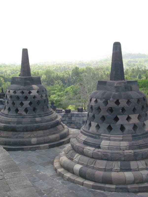Borobudur is a square 123 meters (403 feet) on each side and 32 meters (105 feet) high.Constructed of unmortared grey andosite and volcanic basalt stone and surrounded by lush green fields of the Kedu Plain and tourist infrastructure, it is about the size of a stadium, and took about 80 years to build. Four large volcanos, including the often-smoking Mount Merapi, and numerous hills are visible in the distance. The temple’s design in Gupta architecture reflects India's influence on the region, yet there are enough indigenous scenes and elements incorporated to make Borobudur uniquely Indonesian. The monument is decorated with 2,672 relief panels and 504 Buddha statues.