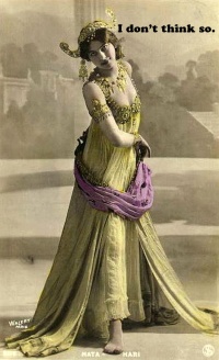 Jonathan Yardley wrote in the Washington Post, “Femme Fatale's central contention is that "it is difficult to imagine a woman less likely . . . to be able to engage in clandestine activities than Mata Hari." She was a star, and "while she was certainly seductive, which might be viewed as useful for a spy, she was never on any occasion invisible"; in fact, she was "a ridiculous candidate for a job that required clandestine behavior." Yet her persecutors "believed firmly that Mata Hari was guilty because she slept with many men and traveled widely in wartime. Such a woman must be a spy." A kangaroo court agreed. Shipman reports that many years later, the prosecutor, André Mornet, talked to a writer about the case and said "with a supreme indifference, 'Between you and me, there wasn't enough [evidence] to flog a cat.' " There's more mystery about the woman than about the charges that cost her life. Shipman probably is right that "she was convicted not for espionage but for her lack of shame," but how she got that way — defiantly, exuberantly, spectacularly — simply can't be explained. [Source: Jonathan Yardley, Washington Post, August 5, 2007]