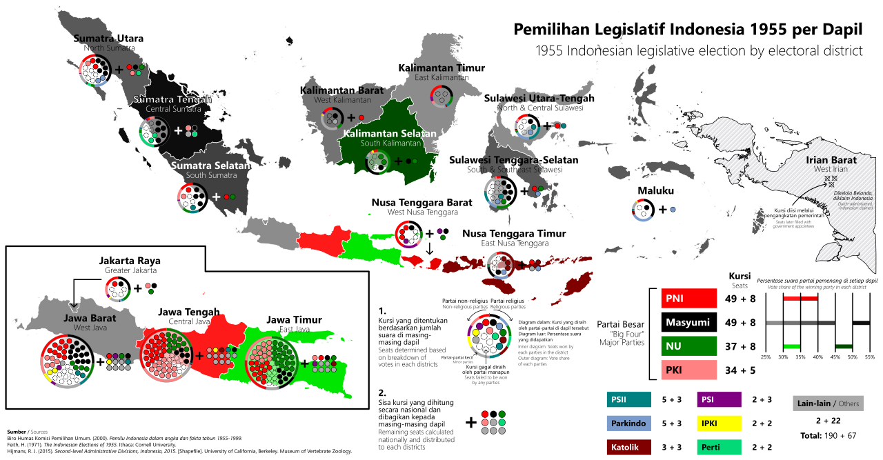 The 1955 election was Indonesia’s first ever election. The election was initially planned for October 1945 but due to the nation’s instability was not finally executed until after Indonesia’s declaration of independence. No limit was placed on the number of parties who could run, leading to a total of 80 parties, organizations and individuals registering as contenders. Every citizen had the right to vote, including the military and police corps. There were two election periods. The September election period was to elect members of the House of Representatives (DPR) while the December election period was to elect members of the “Konstituante,” a special board set up to draft a new constitution.