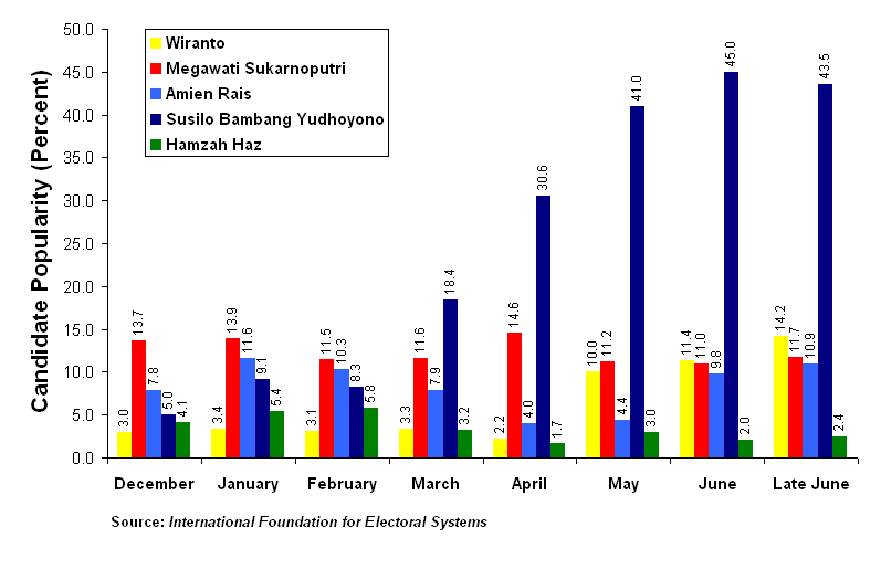 Yudhoyono won the first round presidential election in July, 2004 with 33.6 percent of the vote, shy of the majority he needed to claim outright victory. He was forced into runoff with Megawati, who was second with 26.6 percent of the vote. Wiranto was third with 23 percent. Megawati did much better than expected. Wiranto did more poorly than expected. He had received an endorsement for Nahdlatul Ulama, Indonesia’s largest Muslim organization but took only 33 percent of the members vote. Yudhoyono took 32 percent.