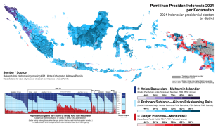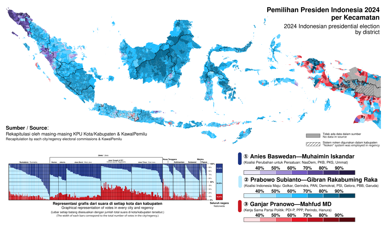Indonesia held general elections on February 14, 2024 to choose the president and vice president as well as members of the People’s Consultative Assembly (MPR), which comprises the House of Representatives (DPR), the Regional Representative Council (DPD), and provincial and local legislatures (DPRD). [Source: Wikipedia]