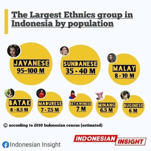 The Indonesian population is made up of 100 to 300 ethnic groups (depending on how they are counted) who speak around 300 different regional languages. Most of the people are of Malay descent. The Javanese are the largest ethnic group. Living primarily in the eastern and central part of Java. The Sundanese, who also live on Java, are the second largest group.