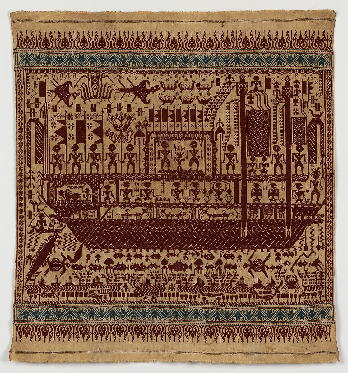 The lndianized imagery of the tampon pasisir probably reflects the influence of the art of the Buddhist Srivijaya empire (ca. A. D. 650- 1400), which flourished just north of Lampung, as well as the kingdoms of the island of Java, immediately to the east. Rigged with sails of joined mats and steered with exterior rudders, which are distinctive to Indonesian and south Asian vessels, the fanciful ships that adorn the tampon pasisir may recall the features of the huge trading ships that plied the seas in precolonial times.