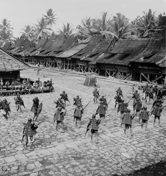“One of the (endorsed) reasons for waging war against other villages or clans was to procure slaves and to plunder their treasures for gold ornaments. The relation between war and slavery is patently obvious, whether it be from the viewpoint, “we attack to obtain slaves”, or the other way around, “you took slaves from us, therefore we wage war against you as revenge and to take them back to us”. Elio Modigliani, Italian entomologist and author of the first scientific ethnography on Nias (1890), constantly refers to the permanent state of war in Nias. Commodities—their ownership and use in feasts came beyond the reach of the average person—there developed a genuine and profitable market for them. Head-taking was a practice that directly led to the show of power because, like owning slaves, the ownership of heads meant that one had the financial means to acquire them. Heads of enemies killed in battle, as well as those brought in by young warriors, were displayed on the front wall of the assembly house (“bale”). Heads taken that were ordered by a chief were hidden in trees or buried, to await use in later festivities. This contradicts the old idea that heads were used for sacrifice, whose climax was the moment of decapitation. =