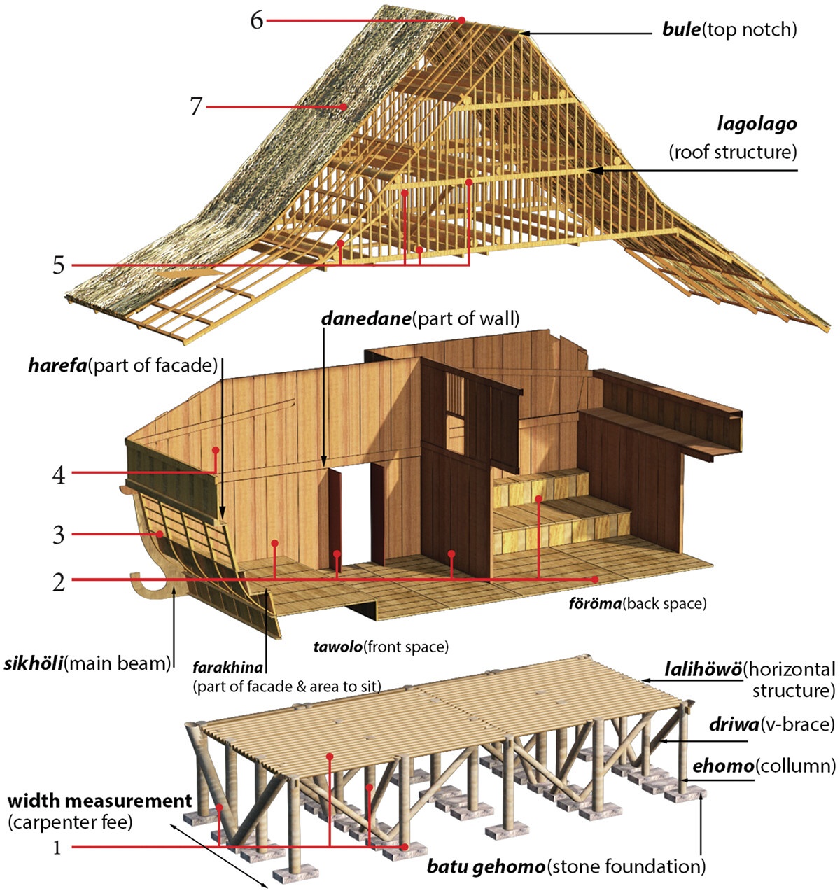 The most prestigious clans are those claiming direct descent from the original ancestors, while other clans are regarded as offshoots. Prestige is primarily determined by seniority. Clans and families are further divided into social categories that include “nobles” (a conventional term indicating higher rank), “people” (sato or ono mbanua, literally “children of the village”), and, until the early twentieth century, “slaves.” The organization of these categories differs across the northern, central, and southern regions and is closely tied to political structures and to the ritual and festive practices that structure Niha social life. It is during these festivities that stone monuments are erected.