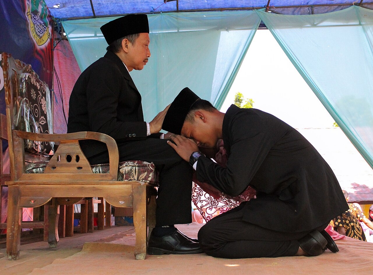 During the ceremony, the bride and groom sit side by side beneath a selendang or veil, representing two individuals united in one purpose. They then perform sungkem, bowing to kiss their parents’ knees to ask forgiveness, receive blessings, and affirm their ongoing devotion and respect. Another ritual, sawer, takes place near a water spout or gargoyle, whose flowing water symbolizes the unending love of parents for their children.