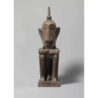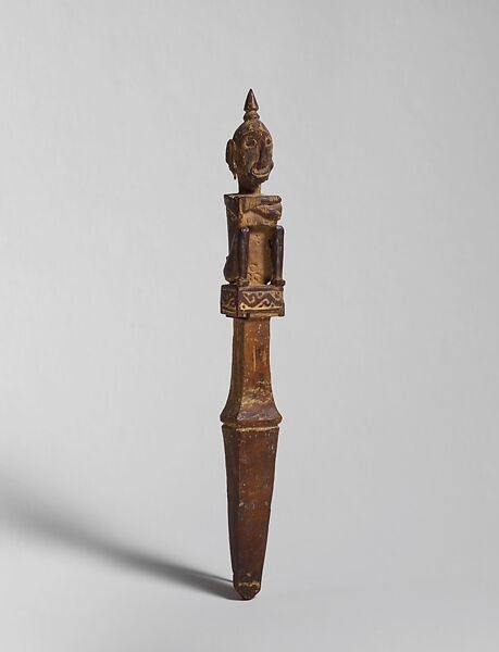 The images on many string winders are female or of indeterminate gender. However, a number of exampl es, including the present work, appear to depict male figures. The Metropolitan's string winder is similar to examples attributed to the island of Kisar, roughly two hundred miles west of Dawera and Dawelor, where the finials of string winders seem to portray both male and female subjects. Wearing earrings and peaked headgear, and seated on the ground with the legs drawn in and the elbows of the crossed arms resting on the knees, the finials of the Metropolitan and Kisar string winders closely resemble the larger ancestor images of the region, in particular the yene figures of the neighboring island of Leti. Although string winders on Kisar were likely employed in a manner similar to those of Dawera and Dawelor, it seems reasonable to suppose that, like yene figures, they portrayed recent ancestors of both sexes rather than a single ancient female progenitor.