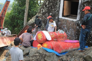 Describing the resting place of Torajan royals before a king was buried there, Paul Watson wrote in the Los Angeles Times, “His father's remains probably will be sealed in a royal tomb carved out of the nearby Suaya cliff, where his brother-in-law's coffin was laid to rest, just as dozens of royals have been through the centuries, including the late king's ancestors. Like wide-eyed marionettes gathering dust on a puppeteer's shelf, life-size wooden dolls representing the dead stare down from balconies outside their tombs. Relatives look up to greet them when they bring offerings, such as cigarettes, palm wine or bottled water, that they set at the base of the cliff. [Source: Paul Watson, Los Angeles Times, August 14, 2008 ==]