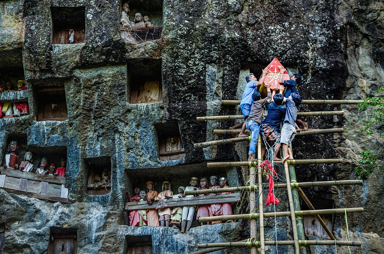Torajan burial practices include placement of coffins in caves, carved stone graves, or coffins suspended from cliffs. Wealthy individuals are commonly buried in stone graves carved into cliff faces. Wooden effigies known as tau-tau are often placed near the graves. Infants may be buried in living trees. The Ma’Nene ritual involves the periodic exhumation, cleaning, and redressing of the deceased. [Source: Wikipedia]
