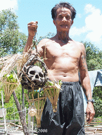 Flyingdusun.com reported: In many parts of contemporary Borneo headhunting is a part of the past preserved in narrative form and in some areas headhunting rituals continue. While in olden days fresh heads were required for certain ceremonies ‘old’ skulls may now be used as replacement, or the skulls of orang utan and even wooden substitutes or coconuts. This is in areas where head-hunting rituals are needed for spiritual benefits such as for agriculture (rice) and the building of a new house (longhouse). In the case of the direct descendants of the Kadazan warrior Monsopiad, yearly simple rites are conducted to maintain and ensure the ‘happiness’ of his 42 skulls and the spirits dwelling therein. The yearly rites were completed with a major ceremony (momohizan) that recurred every five to seven years. The ceremony lasted over several days and was very costly because the whole family had to be gathered, plus of course many friends and all had to be served foods and drinks. It was essentially a very prestigious event for the ‘guardian of skulls’ and his family, where the spiritual purpose outweighed the cost. In fact, the ritual was necessary in order to maintain and renew the spiritual/magical bonds with the otherworld. With the disappearance of the last Bobohizan – the Kadazan ritual specialists – the present keeper of skulls and 6th direct descendant of Monsopiad is worried that the spirits inhabiting the skulls will resort to mischief. The simple ceremonies in order to keep the spirits ‘calm’ must still be conducted on a yearly basis, and certain taboos must be observed by those wishing to see the skulls. [Source: flyingdusun.com ]