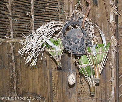 Skulls from headhunting raids have traditionally been displayed in longhouses. Some longhouses today still have heads hanging from the ceiling as relics of their glorious past. The most recent ones are Japanese heads taken in World War II.