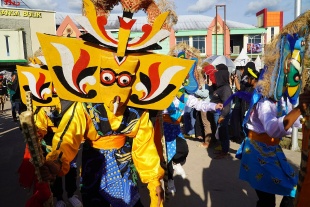 The Dayak perform elaborate death ceremonies in which the bones are disinterred for secondary reburial. The Ngaju Dayaks in the Mendawai area of Kalimantan keep alive their ancient burial rituals called Tiwah. Participants wear bizarre masks, sing, stage mock attacks. They exhume the bones of the dead, anoint and touch the bones and re-intern them in family “sandung”. (House-shaped boxes on stilts). In the old days headhunting was often include in the ritual.