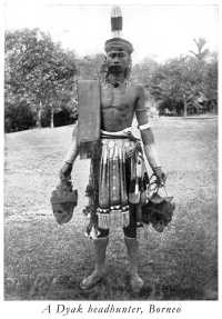 Carl Bock wrote in “Headhunters of Borneo” (1881): ““The barbarous practice of head-hunting, as carried on by all the Dyaks tribes, not only in the independent territories, but also in some part of the tributary states, is part and parcel of their religious rites. Births and “ naming,’’ marriages and burials, not to mention less important events, cannot be properly celebrated unless the heads of a few enemies, more or less, have been secured to grace the festivities or solemnities. Head-hunting is consequently the most difficult feature in the relationship of the subject races to their white masters, and the most delicate problem which civilization has to solve in the future administration of the as yet independent tribes in the interior of Borneo. The Dutch have already done much by the double agency of their arms and their trade to remove this plague-spot from the character of the tribes more immediately under their control.”