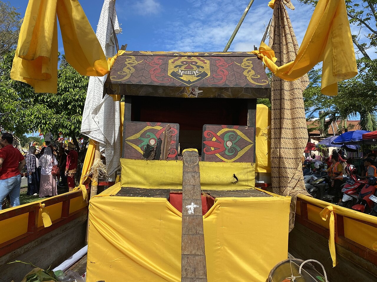 Tiwah ceremonies are held in certain areas maybe once or twice a year with really big ones every five year or so. Numerous families participate and sometimes more than 150 bodies are exhumed. Feasting sometimes lasts for a month. The climax is when the bones are taken from the grave washed and purified. Water buffalo, pigs, chickens, and other animal are sacrificed for the journey to afterlife. To ensure a pleasant afterlife, relatives of the deceased fill boats with food and rice wine and carved servants to accompany the dead in the afterworld.