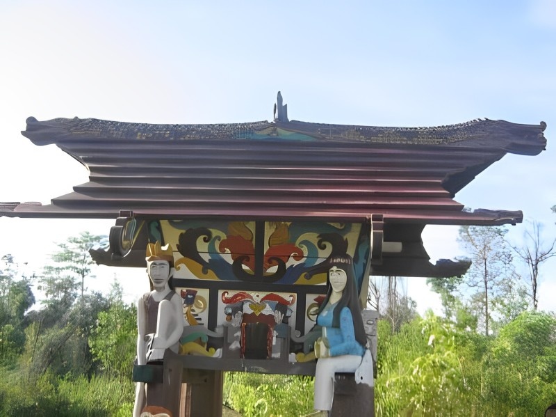 During the tiwah, the bones of the deceased are exhumed from the raung; in some cases, the remains must first be cremated. The bones are then placed in sandung, small mausoleum-like structures about 2 meters high, elaborately carved with images of the hornbill, symbolizing the upper world, and the naga serpent, representing the lower world. Among the Ma’anyan, the remains of entire families may be interred together in larger mausolea known as pambak. While traditional sandung were made of wood, modern examples are often constructed from concrete. Sacrificial animals are slaughtered while bound to a sepunduq, a carved post depicting fearsome demons with fangs, protruding tongues, and elongated noses. Another important form of funerary art is the sengkaran, a 6-meter pole representing the tree of life and the structure of the cosmos. At its summit is a hornbill flying above a forest of spears embedded in the back of a naga resting on a Chinese heirloom jar. Also significant are the “ships of the dead,” small model sailing vessels crewed by benevolent spirits fashioned from gutta-percha; today, such models are produced throughout Kalimantan, often for sale to tourists.