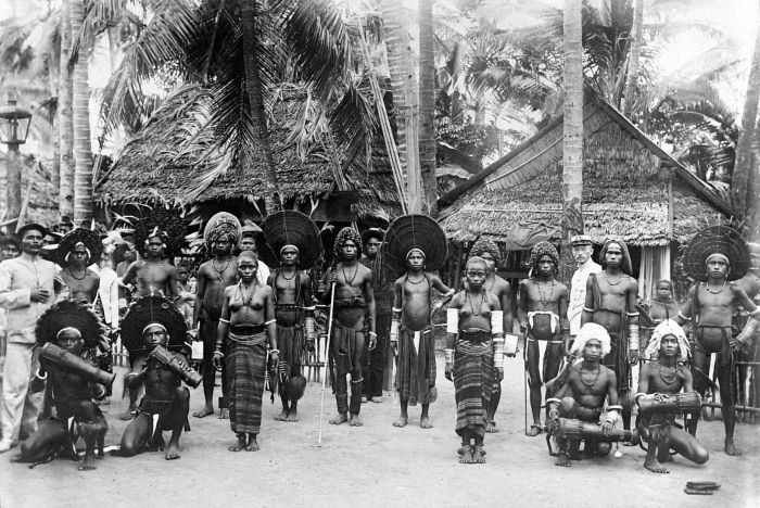 P. Boomgaard wrote in 2001: The villages of the Tanimbar Islands were often embroiled in long-standing feuds, something that was also quite common elsewhere in the archipelago. They also formed alliances with each other. Such alliances had to be renewed from time to time, for which purpose one village would visit the other every few years. A return visit would then be made the same number of years later. On these occasions, gifts were exchanged, and dancing, especially long and frequent, took place. On these occasions, the wealthy displayed their wealth by adorning themselves with all their jewelry. Note also the men's hats (made of two-tone cotton).