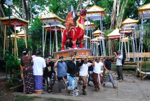 “During the week before cremation, the members of the Banjar bring gifts to the families of the deceased. In turn, the families feed everybody in the Banjar, and entertain them with a gamelan band. Meanwhile, in the front yard of a house on Ubud's main street, they're building a bull. which will be the funeral pyre for the royal. It's built from bamboo, then covered by velvet and decorated with tinsel and spangles: After the street is washed, the bull and tower are picked up and carried to the cremation site. Holy water is spritzed on the carriers. The course is uneven, with much shaking, to shake off any evil spirits that may be hanging around.