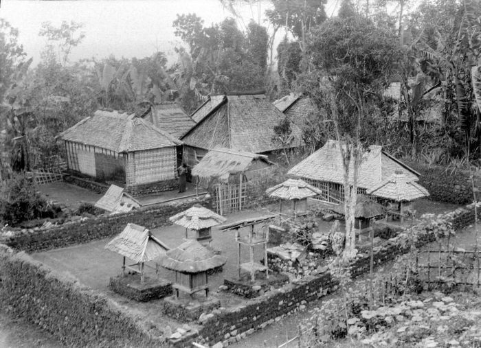 Tenganan and Trunyan are two traditional villages, each with its own unique architecture. Both villages are of old Balinese origin, Bali Aga, which preceded the migration of Javanese royals from the Majapahit Empire to Bali in the 15th century. The Bali Aga do not follow modern Balinese Hinduism and have moved to their inner enclosures to stay away from the ‘foreign’ Javanese influences. Unlike the common nine-building concept of Balinese house architecture, traditional houses in Tenganan and Trunyan consist of two main buildings only: 1) a large building which consists of some bed rooms, kitchen, terrace and 2) a family temple. All the bedrooms, kitchen, terrace are built in on a piece, large building. The village temple is built from big stones with relatively few relief carvings.