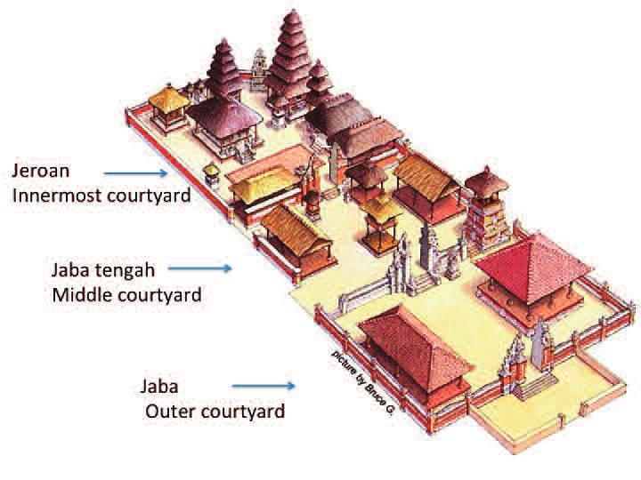 Balinese households continue to preserve the integrity of their traditional compound design. A typical home consists of a walled enclosure containing several small, separate buildings arranged according to strict spatial rules. These layouts are governed by the principle of kaja–kelod, a directional system that shapes all aspects of domestic life. Kaja points toward the inland mountains—especially the sacred Gunung Agung—while kelod leads toward the sea and is considered “downward” in spatial terms. People sleep with their heads facing kaja, and the head of the household occupies the most kaja building in the compound. Functions associated with impurity, such as kitchens, toilets, pig pens, and rubbish areas, are placed toward kelod. Although kelod implies movement away from the sacred mountain, it does not signify an impure destination, since the sea itself is a powerful source of purification. Many rituals are performed there, and cremation ashes are ultimately cast into its waters. [Source: “Culture and Customs of Indonesia” by Jill Forshee, Greenwood Press, 2006]