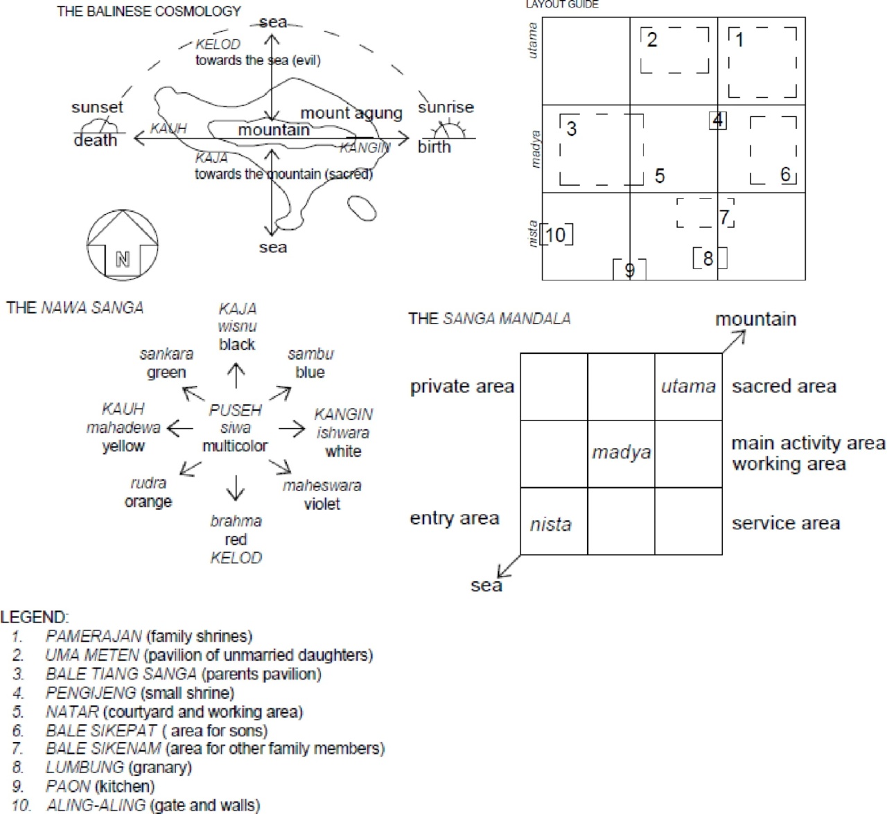 Traditional Balinese concept adopts Hinduism and Chinese Buddhism. The chief ingredient, a Hindu’s concept called Tri Mandala, conveys an integrated three areas; Nista, Mandala, Utama. Nista is an area for the dirty aspects (real or abstract). Nista area is on the southern side of a house or a temple. The southern side belongs to sea, the neutral agent where bad auras will be dilluted. Mandala is the neutral area. Mandala is located between the south and north side. Utama is holy area. It is located on the northeastern side. The north belongs to mountain, the holy area according to Hinduism.