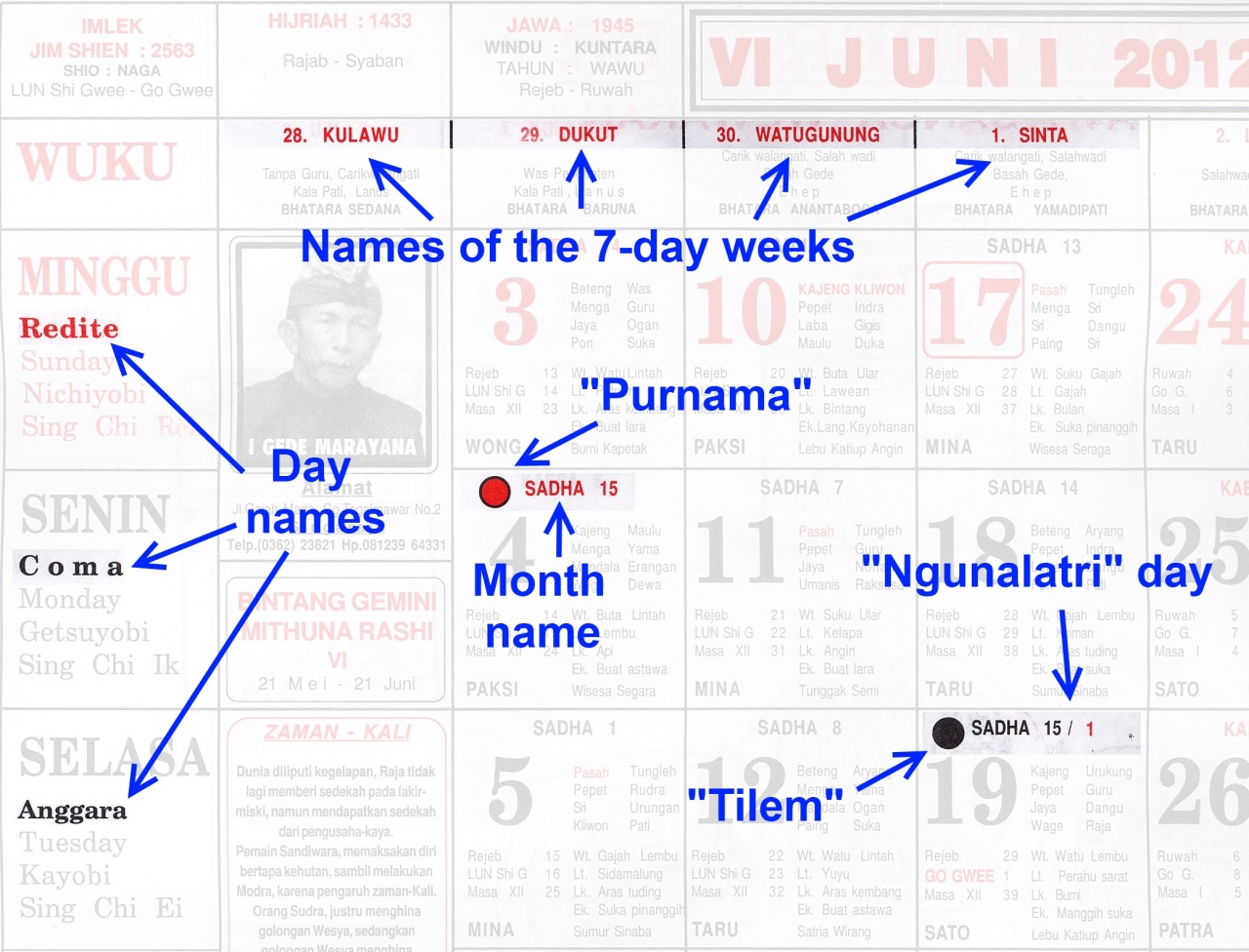 For timekeeping, days are numbered within the lunar month (wulan) as is common in other calendar systems. The date indicates the change in the moon, and symbolizes the life of a human in the world. This process of revolving life is known as cakra manggilingan or heru cakra. On the first day of the month, when the moon is small, it is compared to a newborn baby. The 14th day, called Purnama Sidhi (full moon), represents a married adult. The next day, called Purnama, occurs as the moon begins to wane. The 20th day, Panglong, symbolizes the point at which people begin to lose their memory. The 25th day, Sumurup, represents the point at which the adult requires care like when they were young. The 26th day, Manjing, represents the return of the human to his or her origin.[Source: Wikipedia +]