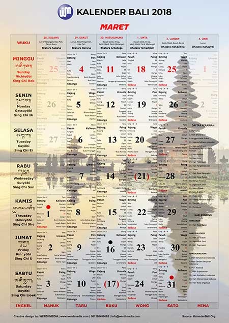 The Balinese calendar — Saka-Wuku — is a combination of: 1) the Saka, the Hindu solar-lunar year of 12 moons; and 2) the Javanese-Balinese Wuku calendar of 210 days which is divided into weeks. The combination of these two calendars and the many names for the different weeks and days make the Balinese calendar a complicated puzzle to solve. Experts in the field consult special charts and tables to determine days for the various religious festivals and significant days.