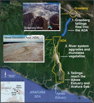 “By Freeport's own estimates,” it “will generate an estimated six billion tons of waste before it is through - more than twice as much earth as was excavated for the Panama Canal. Much of that waste has already been dumped in the mountains surrounding the mine or down a system of rivers that descends steeply onto the island's low-lying wetlands, close to Lorentz National Park, a pristine rain forest that has been granted special status by the United Nations. -