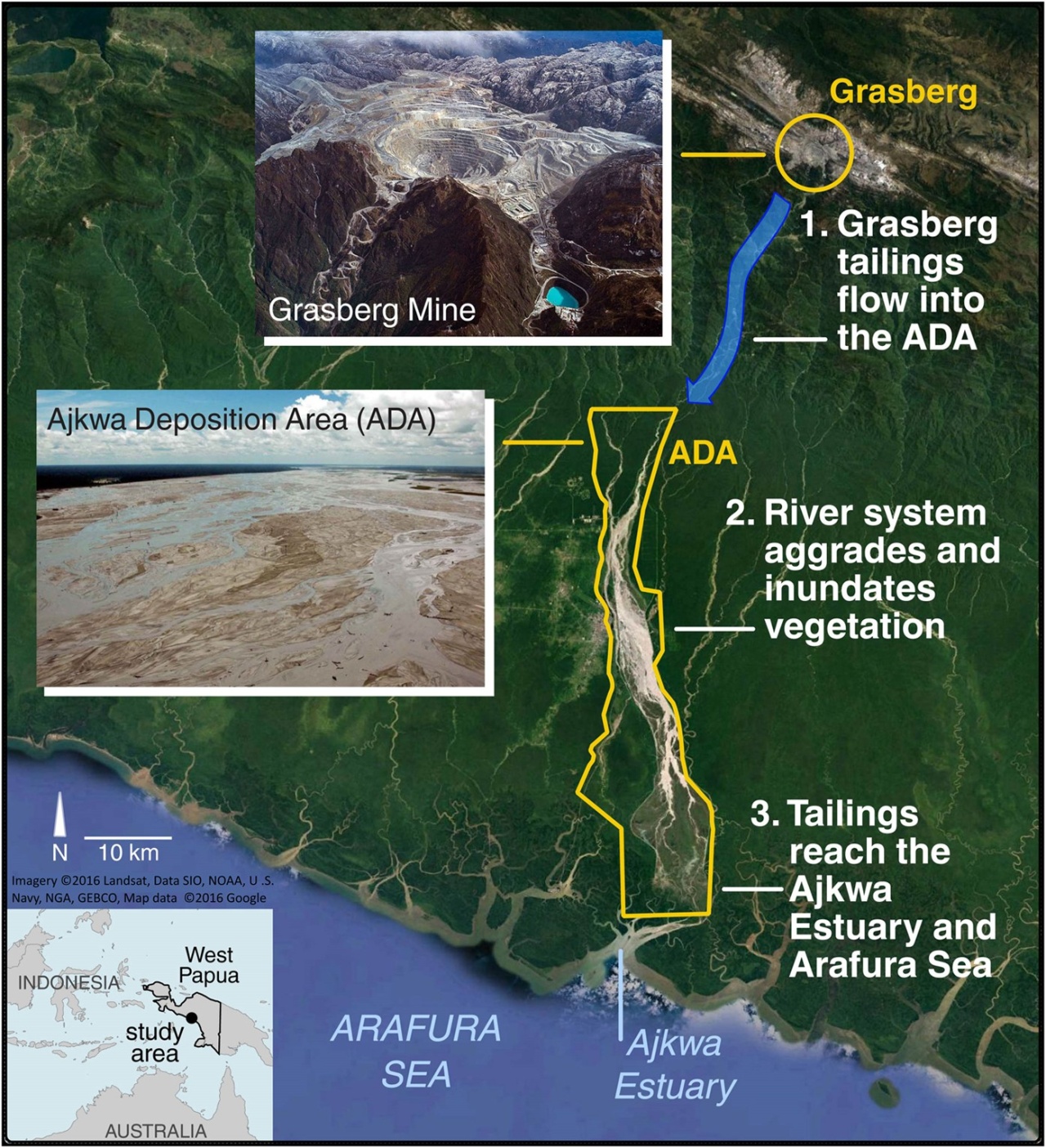 The Grasberg mine generates roughly 700,000 tonnes of tailings per day and these are discharged into the Aikwa river system, creating extensive sedimentation zones in the lowlands and degrading aquatic habitat. Overburden stored in the highlands produces acidic runoff that enters the Wanagon River. Freeport states that overburden is placed at limestone-capped, monitored sites and that tailings are confined within engineered levees in the lowlands. Indonesian Environment Ministry data from 2004 recorded sediment levels far above legal limits. [Source: Wikipedia]