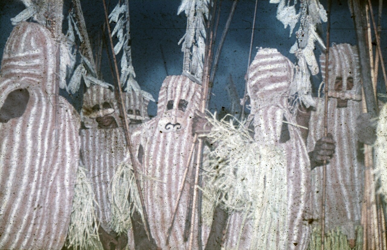 Each mask represents a specific ancestor whose name it bears and is typically worn by a close relative of deceased. The group of masks can number between six and twenty in a single feast ceremony. They are fondly greeted by their relatives and tour the village where they are presented with food and hospitality. They proceed eventually to the men’s house (yeu) where all dance together, the living and the dead mingling in a lively engagement which continues into the night. The following morning the dead, their spirits (appeased by the feast and entertainment they have received, or frightened at the prospect of challenges that will be made to them if they do not move on) disappear into the forest to make their journey onwards to safan where they will be transformed into ancestral beings.