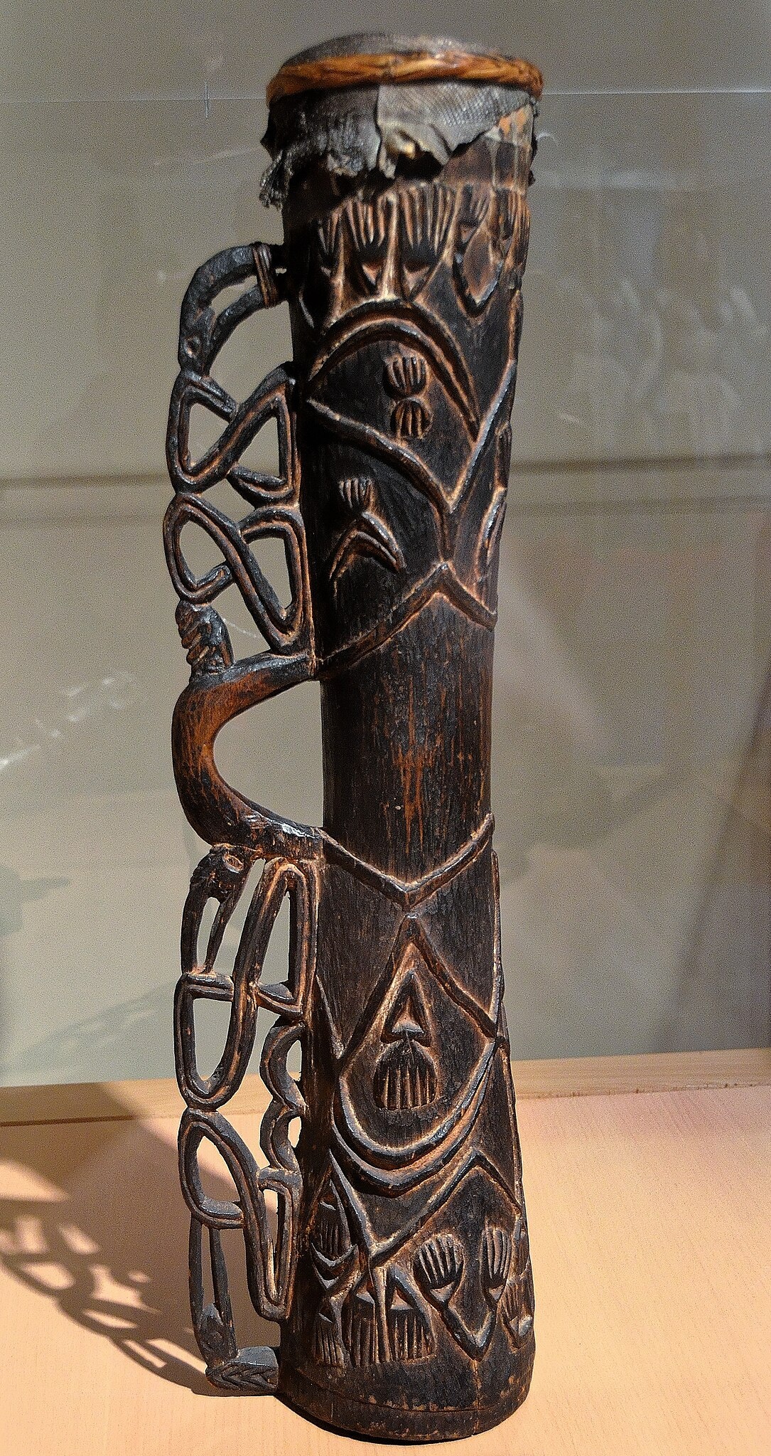 Lizard-skin tympanums (drum heads) are attached to the drums with an adhesive mixture of lime and human blood. Handles are elaborately carved, usually with images of relatives and the heads of parrots and cockatoos. One drum in the Metropolitan Museum of Art collection was made by Chief Omas in the mid-20th century from wood, lizard skin, beeswax, sago palm leaves, fiber, paint and human blood. It originates from Sauwa village in the Pomatsj River region and measures 57.8 × 31.8 × 24.1 centimeters (22.75 inches high, with a width of 12.5 inches and a depth of 9.5 inches. The figure on this particular work probably represents the father of the owner. The designs on the base of the drum depict the shell-nose ornaments worn by Asmat warriors.