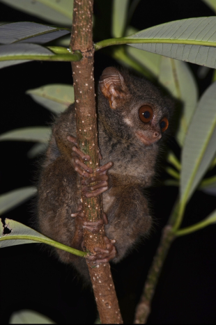 There are 13 living species of tarsier, all in the genus Tarsius, nearly all of them in Indonesia, primarily Sulawesi. Similar in size, morphology, and ecology, members of all tarsier species are all small, nocturnal (active at night), predatory primates known for their leaping and clinging abilities. They prefer secondary forests and mangroves with dense vegetation rather than canopied primary forests. The longest reported lifespan for a tarsier in captivity is over 17 years. The oldest individual caught in the wild was estimated to be 10 years old. Tarsiers change their behavior due to old age between 14 and 16 years of age. Signs of advanced aging may include graying of hair around the face and dental wear. For most tarsier species there are healthy numbers. The biggest threats to tarsiers are deforestation, habitat loss and capture by humans. [Source: Sabrina Archuleta, Animal Diversity Web (ADW
