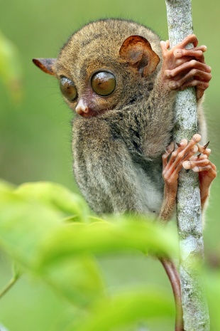 Tarsiers (Tarsiidaetarsiers) are bizarre, lemur-like primates. About the size of al chipmunk and the same basic shape of an African bush and found only in the rainforests and jungles of Borneo, Indonesia and the Philippines, they have enormous eyes and a gremlin-like smile and can rotate their head nearly 360̊. They forage for food at night and are particularly fond of eating cockroaches Tarsiers are found only in some rainforest in some parts of the Philippines and Indonesia.
