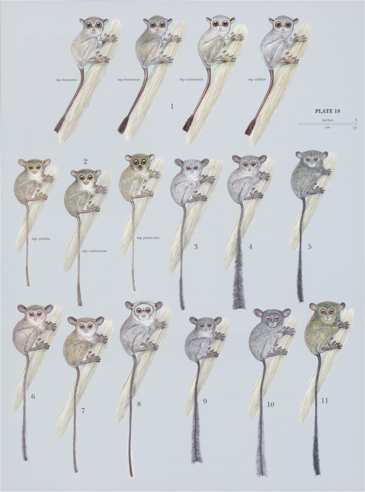Tarsier species: 1) Western Tarsier (Cephalopachus bancanus), 2) Philippine Tarsier (Carlito syrichta), 3) Selayar Tarsier (Tarsius tarsier), 4) Makassar Tarsier (Tarsius fuscus), 5) Dian’s Tarsier (Tarsius dentatus), 6) Peleng Tarsier (Tarsius pelengensis), 7) Great Sangihe Tarsier (Tarsius sangirensis), 8) Siau Island Tarsier (Tarsius tumpara), 9) Sulawesi Mountain Tarsier (Tarsius pumalus), 10) Lariang Tarsier (Tarsius lariang), 11) Wallace’s Tarsier (Tarsius wallacei)