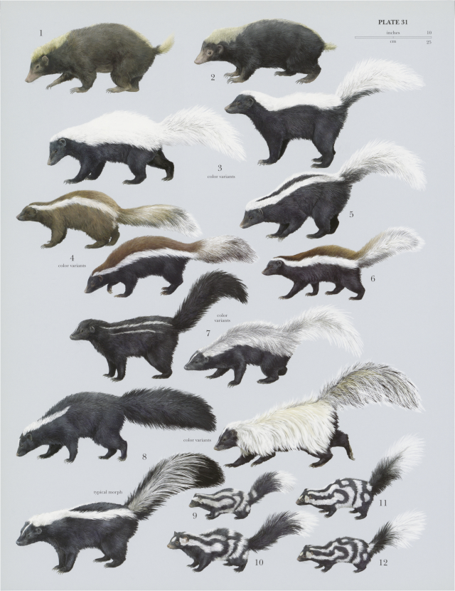 stink badger and skunk species: 1) Sunda Stink Badger (Mydaus javanensis), 2) Palawan Stink Badger (Mydaus marchei), 3) American Hog-nosed Skunk (Conepatus leuconotus), 4) Molina’s Hog-nosed Skunk (Conepatus chinga), 5) Striped Hog-nosed Skunk (Conepatus semistriatus), 6) Humboldt’s Hog-nosed Skunk (Conepatus humboldti), 7) Hooded Skunk (Mephitis macroura), 8) Striped Skunk (Mephitis mephatis), 9) Pygmy Spotted Skunk (Spilogale pygmaea), 10) Eastern Spotted Skunk (Spilogale putorius), 11) Western Spotted Skunk (Spilogale gracilis), 12) Southern Spotted Skunk (Spilogale angustifrons)