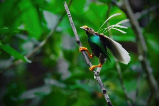Wilson's birds-of-paradise (Cicinnurus respublica or Diphyllodes respublica) are endemic to Indonesia and live in hill and lowland rainforests up to 300 meters on Waigeo and Batanta Islands off West Papua. They eat fruits, insects, other arthropods and other small invertebrates such as lizards. Wilson's birds-of-paradise are classified as Near Threatened on the IUCN Red List of Threatened Species and placed in CITES Appendix II. They are threatened by ongoing habitat loss, limited range and exploitation. [Source: Wikipedia]