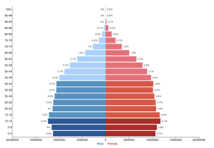 Age structure: 0-14 years: 23.8 percent (male 34,247,218/female 32,701,367); 15-64 yers: 68.3 percent (male 96,268,201/female 95,961,293); 65 years and over: 8 percent (2024 estimate) (male 10,284,628/female 12,099,758), Age structure in 2014: 0-14 years: 26.2 percent (male 33,854,520/female 32,648,568); 15-24 years: 17.1 percent (male 22,067,716/female 21,291,548);25-54 years: 42.3 percent (male 54,500,650/female 52,723,359); 55-64 years: 7.9 percent (male 9,257,637/female 10,780,724); 65 years and over: 6.4 percent (male 7,176,865/female 9,308,056). [Source: CIA World Factbook, 2025]