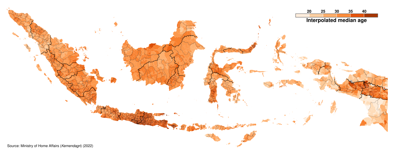 Median age: total: 31.8 years (2025 estimate); male: 30.8 years; female: 32.3 years. Median age in 2014: total: 29.2 years; male: 28.7 years; female: 29.8 years. Based on estimates for 2009, Indonesians aged nine or younger represent the largest age cohort, totaling some 44.9 million, or nearly 19 percent of the population. Data from the 2020 Indonesian Census indicated that 70.7 percent of the population is in the productive age group of 15 to 64 years. In terms of age structure, 23.3 percent of the population was aged 0 to 14, 70.7 percent fell within the working-age group, and 6 percent were aged 65 and above.