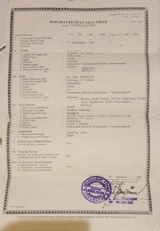 Marriage in Indonesia must adhere to one of the six government-recognized religions. Muslim Marriage are conducted through the Office of Religious Affairs (KUA) and registered via a Buku Nikah. Non-Muslim Marriage are Conducted by religious authorities (church/temple) and then recorded with the Civil Registry Office (Catatan Sipil) to receive a marriage certificate. [Source: U.S. Embassy & Consulates in Indonesia}