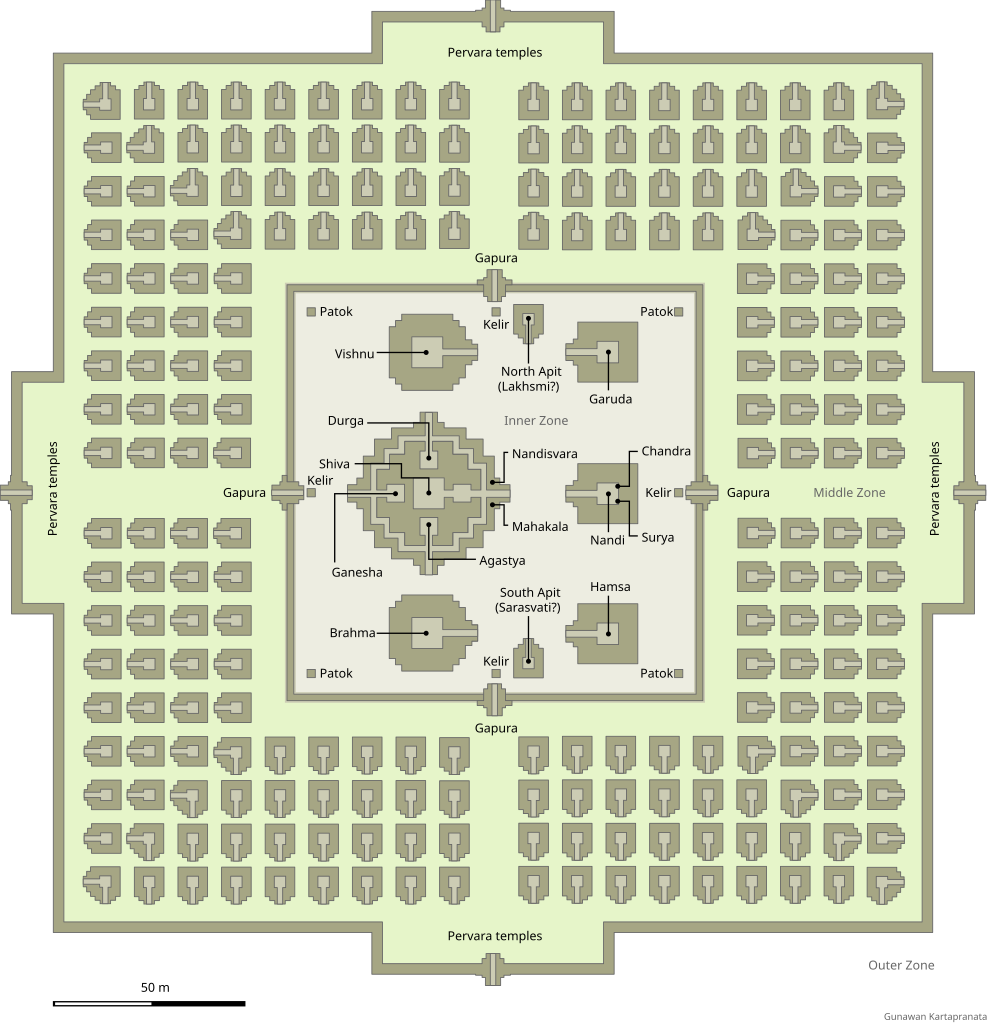 A square platform is divided into concentric courts by square-plane walls. In the middle of the last enceinte stand the temples dedicated to the three great Hindu gods and three small temples dedicated to their animal vehicles (Bull for Siva, Eagle for Brahma and Swan for Vishnu). Other minor temples were located at the entrance gates or outside the central enceinte (four ensembles).