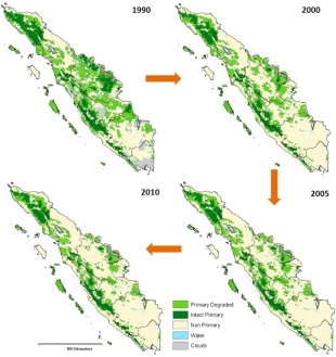 Sumatra was once dominated by dense rain forest. It still supports a rich diversity of plant and animal life, but nearly half of its tropical rainforest has disappeared over the past few decades. As a result, many species are now critically endangered, including the Sumatran ground cuckoo, Sumatran tiger, Sumatran elephant, Sumatran rhinoceros, and Sumatran orangutan. Large-scale deforestation has also contributed to fires and recurring seasonal haze that affects neighboring countries, notably during the severe Southeast Asian haze of 2013, which strained relations between Indonesia, Malaysia, and Singapore. Because of the scale of environmental damage, scholars have increasingly described deforestation in Sumatra and other parts of Indonesia as an ecocide.