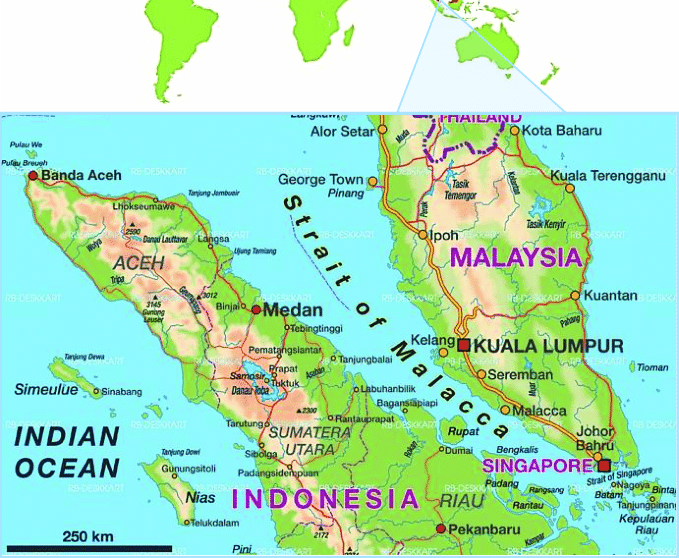 The Strait of Malacca is a narrow strait of water that divides the Indonesian island of Sumatra from Malaysia and Singapore. It is also one of the world’s busiest shipping lanes. The 890-kilometer-long waterway carries one third of the world’s trade and one half of the world’s oil supply. Carrying more ships everyday than the Panama and Suez Canals combined, its strategic importance can not be underestimated. The strait doesn't lie in international waters but is located in the territorial waters of Indonesia, Malaysia and Singapore and these countries are responsible for patrolling it.