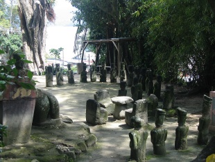 Further north are the villages of Ambarita and Simanindo. At Ambarita, some four kilometers from Tuktuk are groups of megaliths and 300-year-old stone chairs, said to have been a place where criminals were sentenced and beheaded. At Simanindo, 19 kilometers. north of Tuktuk is the elaborately decorated house of Raja Sidauruk, which is now a museum. Here sigalegale puppet performances are regularly performed. The human-sized sigalegale puppets are believed to be a receptacle for the soul of the deceased at funeral rites. Simanindo also has some well-restored traditional houses. Panguran is a town outside the tourist zone that lies ay the middle of an area with traditional villages and superb scenery.